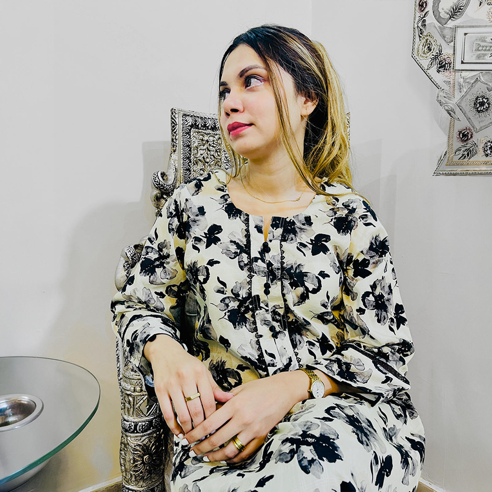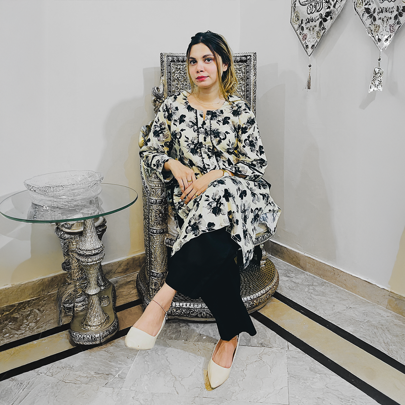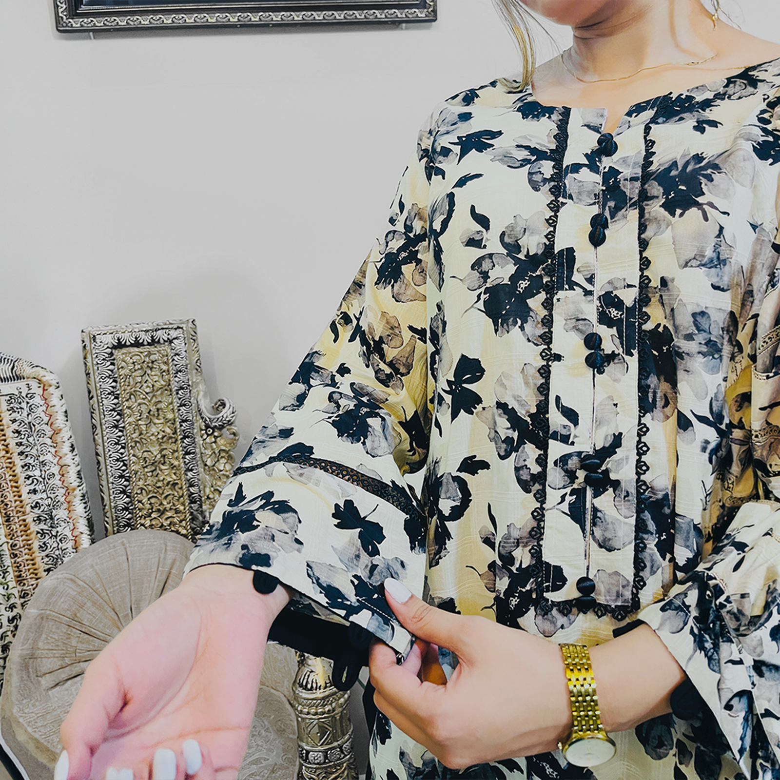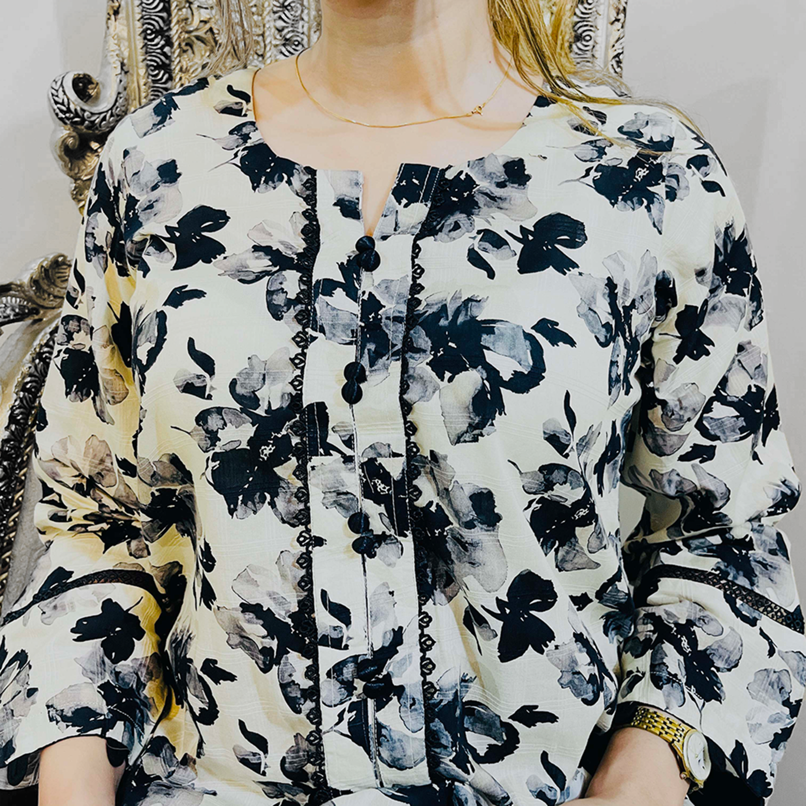 Design: Elegant overall black rose print on a light base, creating a bold yet balanced look