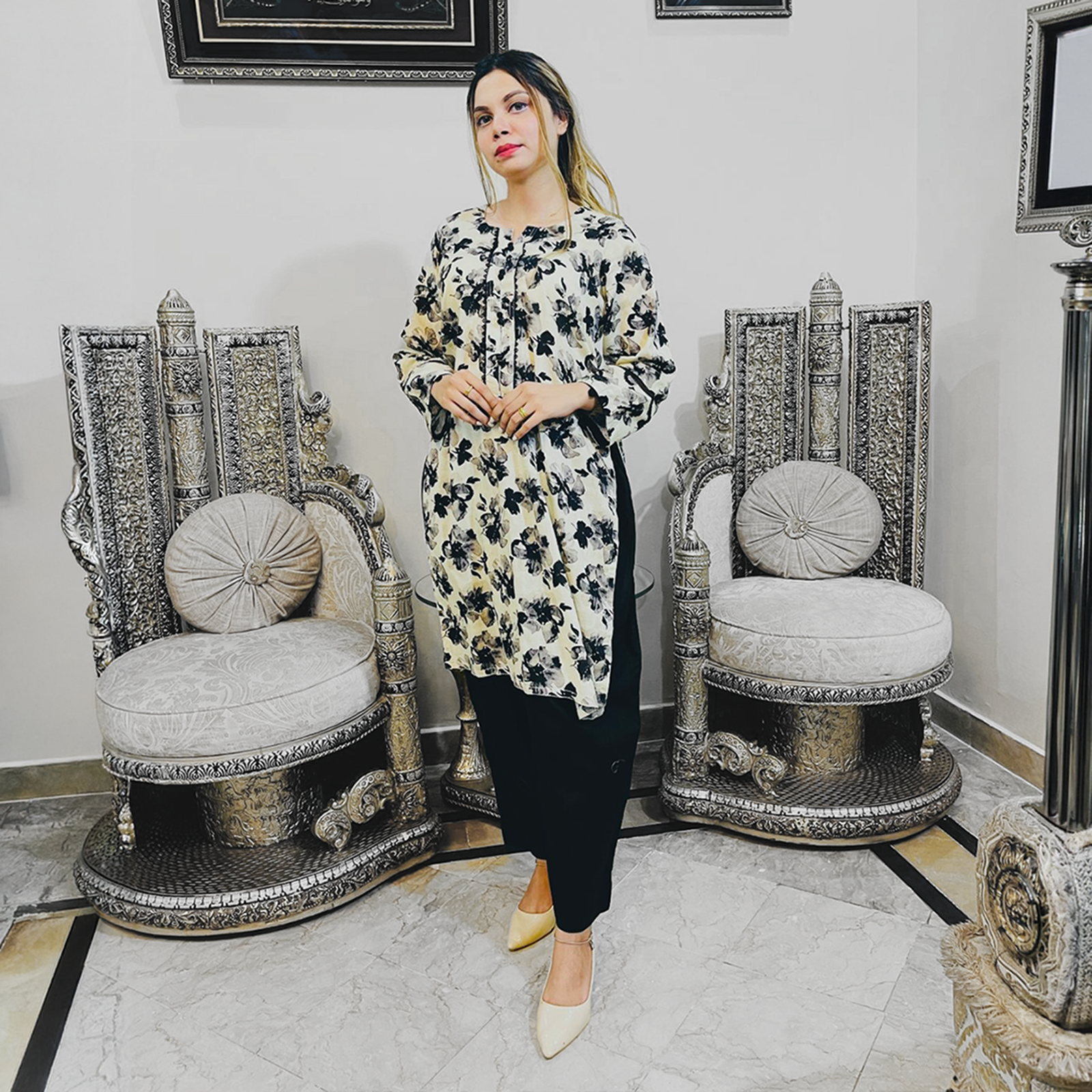 Color: White with a yellowish tone kurta contrasted with a solid black pajama